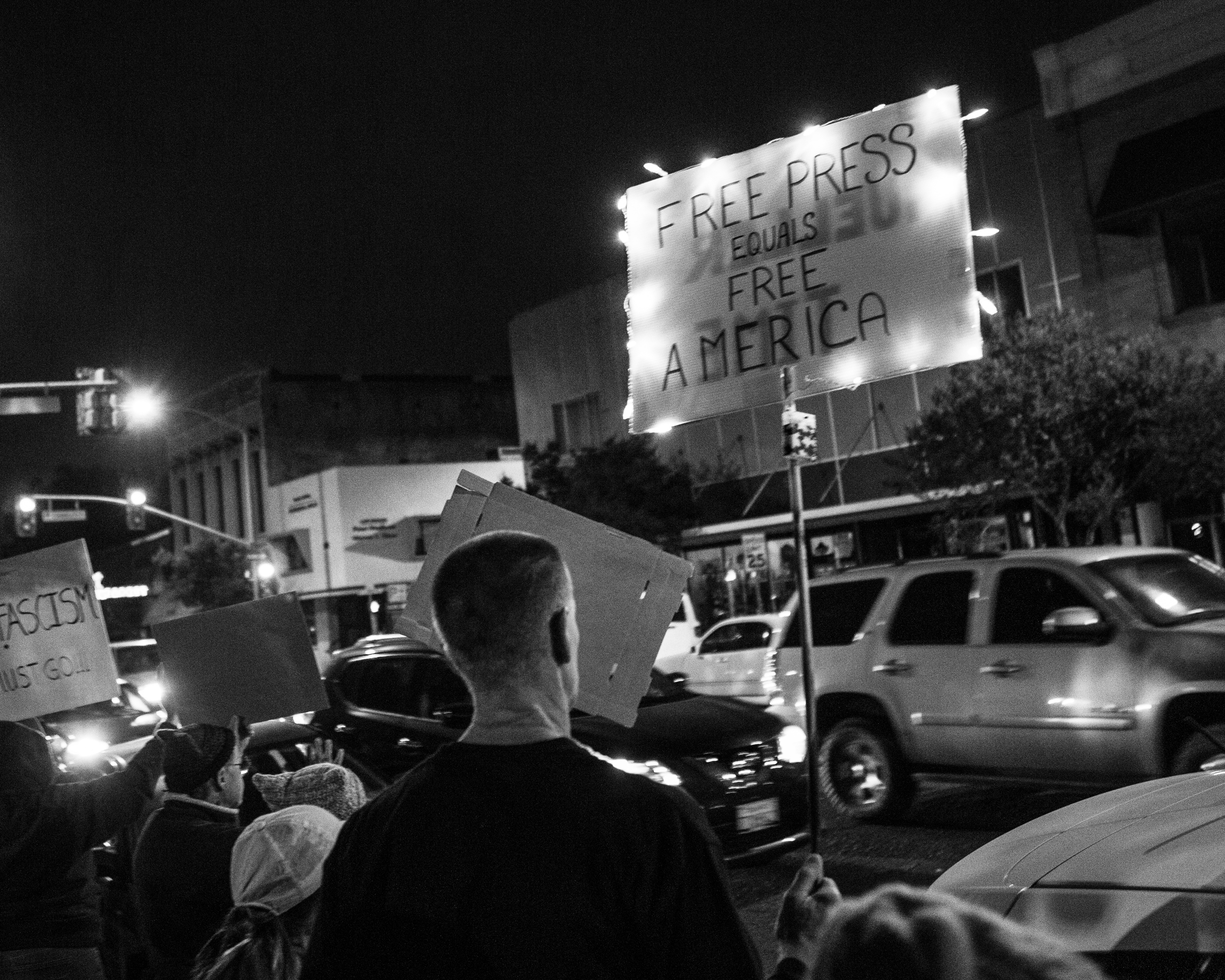 A demonstrator holds a sign supporting the free press during a rally at the Mendocino Courthouse on Nov. 8, 2018. (Chris Pugh — Ukiah Daily Journal)