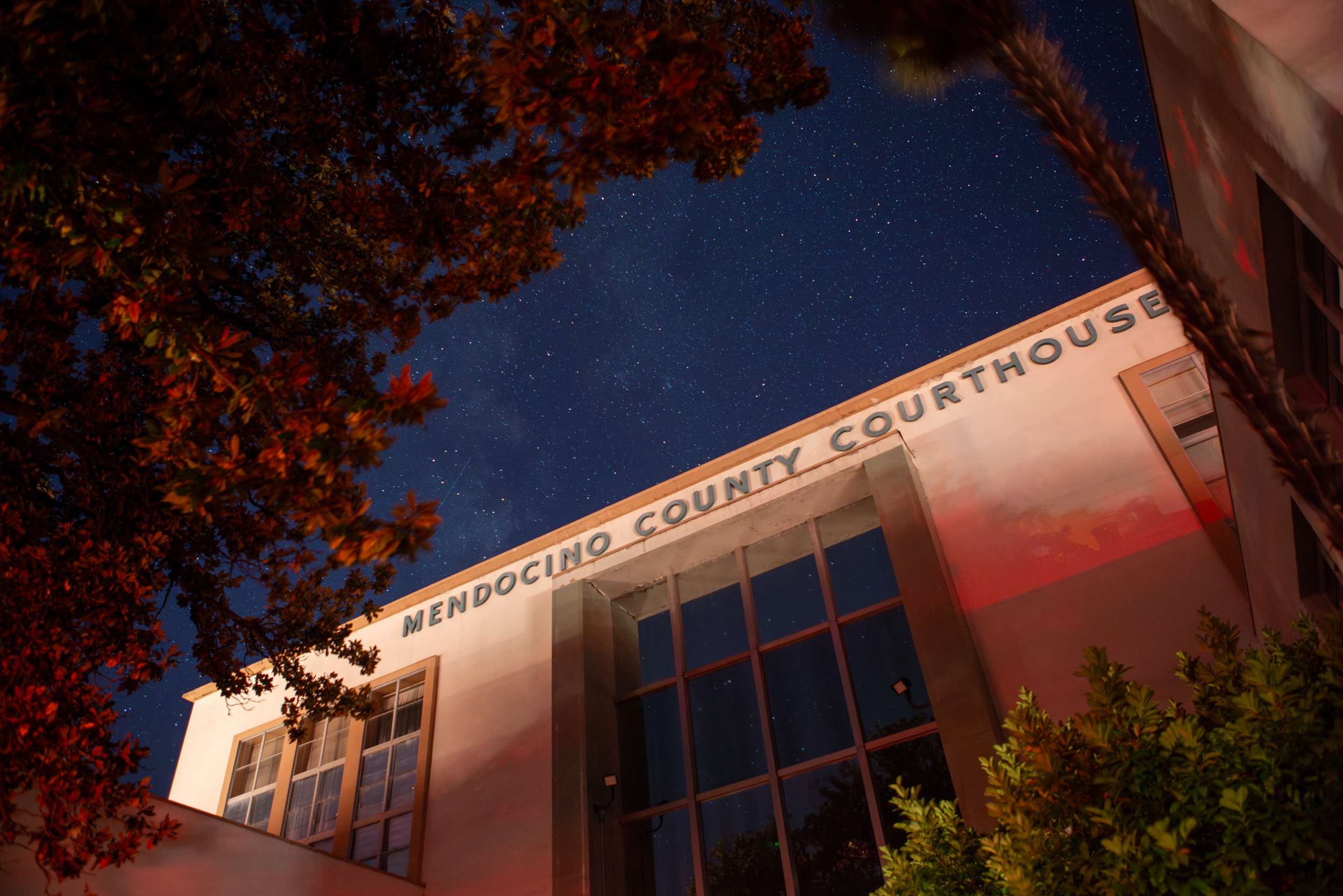 The Mendocino County Courthouse stands in darkness during a PG&E Public Safety Power Shutoff on Oct. 26, 2019. The planned outage was intended to reduce wildfire risk during hazardous conditions. (Chris Pugh — Ukiah Daily Journal)